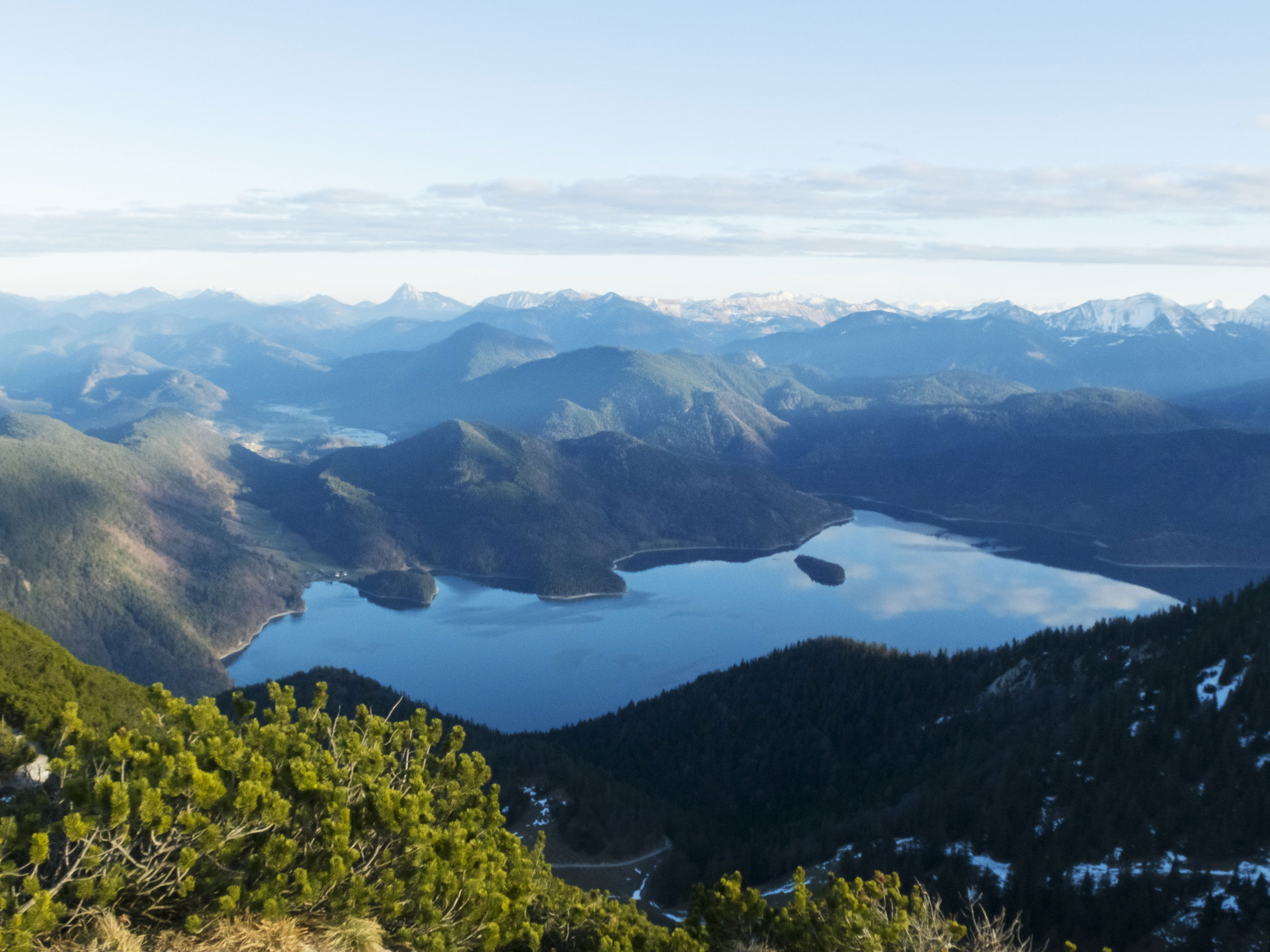 Sie entdecken im Überflug das Westufer des berühmten Starnberger Sees; von dort aus geht es direkt weiter zum Walchensee – einem der tiefsten (max. 190m) und zugleich größten Alpenseen Deutschlands. Nordwestlich davon liegt mit dem weit bekannten und beliebten Gipfel des Herzogstand (1.731m) das nächste Etappenziel.